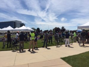 Juniper Networks and Moffett Park Business Group (MPBG) hosted the 15th Annual Bike to Work Extravaganza on May 11th. Bicyclist of all levels of experience joined in on a fun ride that started at Juniper Networks, took them through the Moffett Park, and back to Juniper Networks where they started. After the fun ride, under a clear blue sky, the participants enjoyed sandwiches, chips and cookies provided by Juniper Networks. To top off the event, MPBG and Juniper Networks provided a drawing full of fun prizes, with the grand prize a drone. Everyone had their fingers cross at this point hoping to win it. After all the prizes were given and all the lunches were consumed everyone rode off ready to face their afternoon meetings and projects!